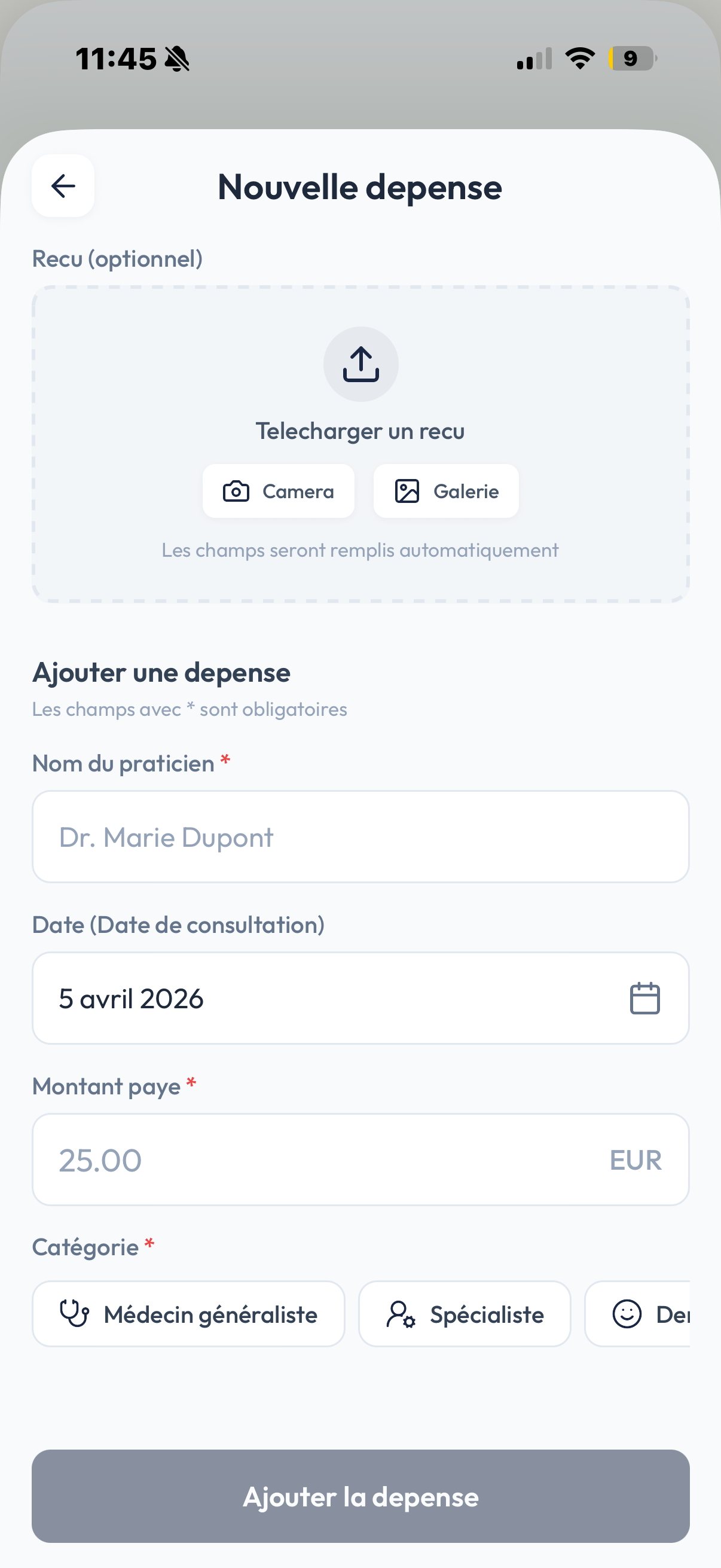 Ajoutez vos consultations manuellement ou scannez vos justificatifs avec l'IA. Médecin, dentiste, labo, pharmacie — tout au même endroit.
